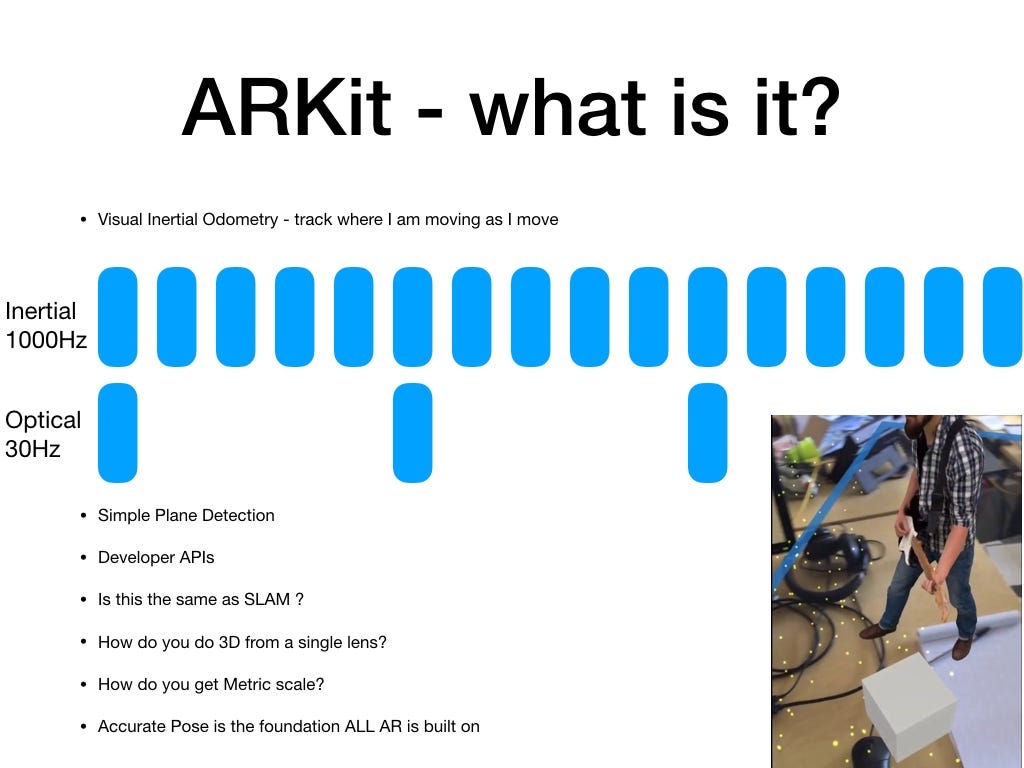Matt Miesnieks wrote a post on Medium during his time as the Founder of 6d.ai (company acquired by Niantic) to describe Apple's then-new release of ARKit. If you are interested in building AR applications and want to learn more about the technology, please read the full blog post here: https://medium.com/6d-ai/why-is-arkit-better-than-the-alternatives-af8871889d6a