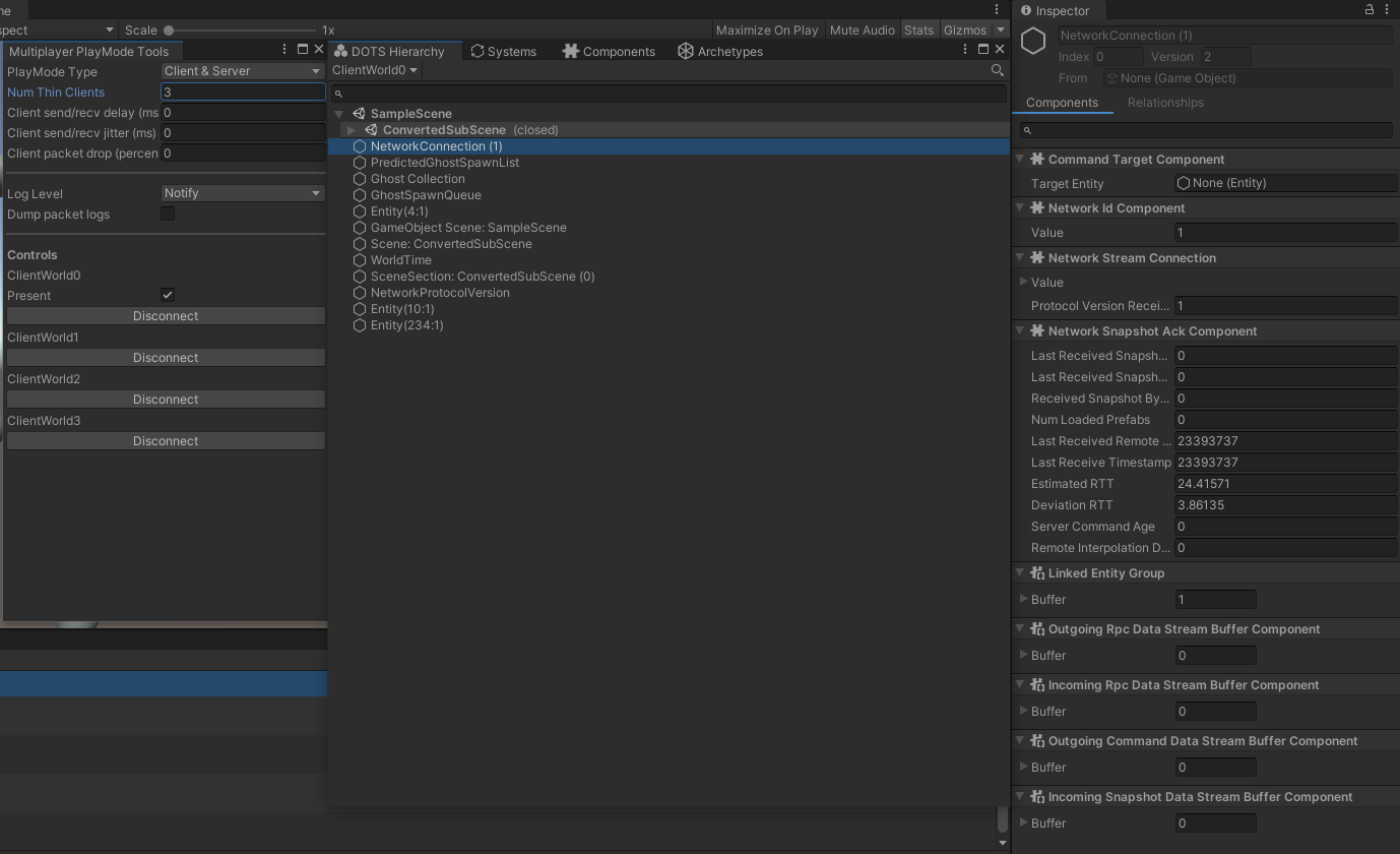 So if there were 2 clients set in "PlayMode Tools" we would see "ClientWorld0" and "ClientWorld1"