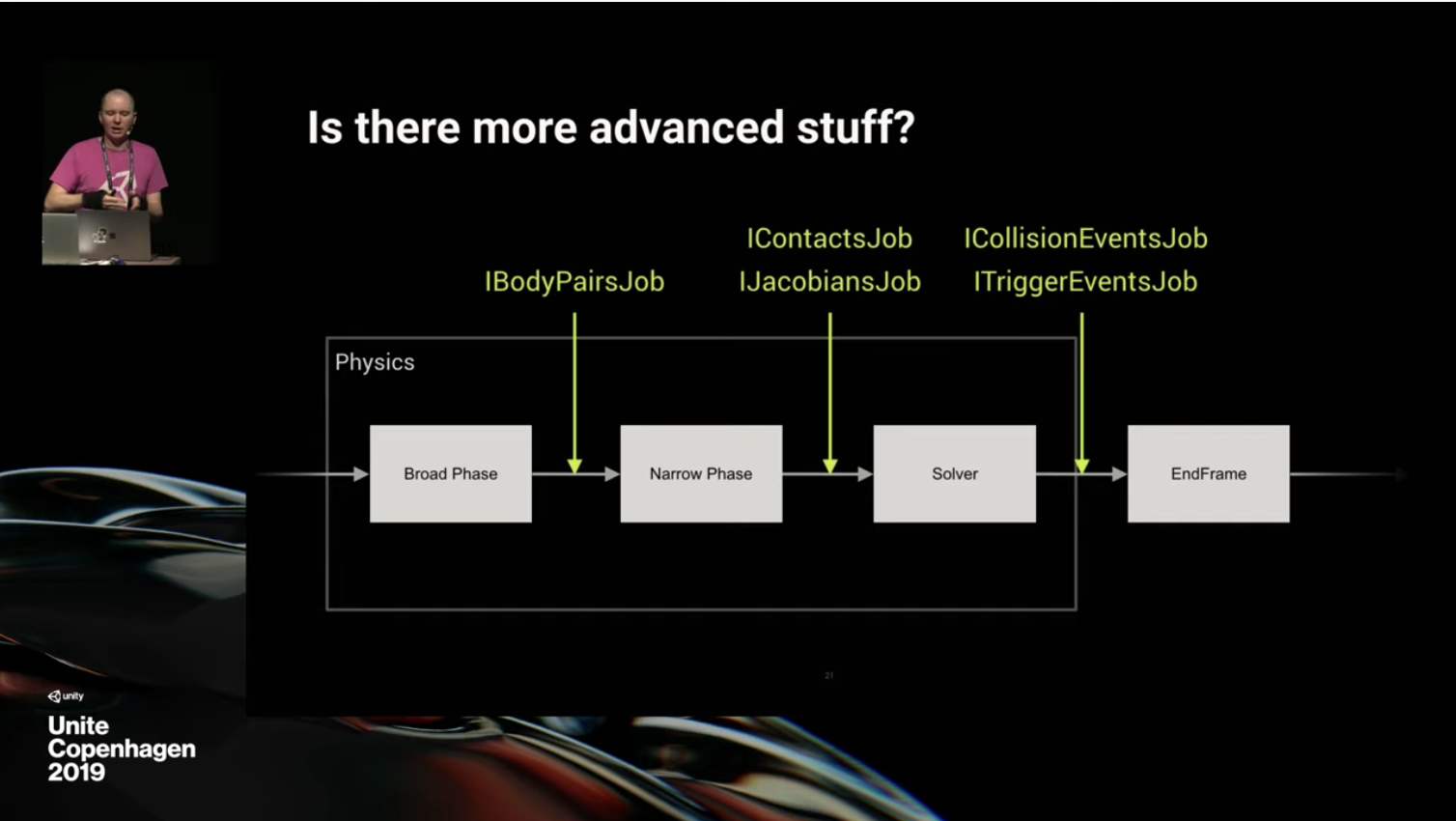 So there's also some more advanced stuff in here depending upon how deep you want to go. If you think about cutting up the Physics system into (1) Broad Phase (just getting overlapping pairs), (2) Narrow Phase (where you're generating contact points), and the (3) Solver (where you're integrating and applying constraints and so forth), we have different custom job types where you can actually sort of inject in-between these systems to make modifications. This is really important if you're doing, let's say, a racing game. for example. You might need to do some modifications at a very low level in order to achieve the types of behaviors that you would expect in those scenarios. For example, you can create an IBodyPairsJob that would execute in between the Broad Phase and Narrow phase, so you could maybe filter out pairs of bodies that otherwise would overlap because something about your game state has changed. Or, between the Narrow Phase and the Solver, you can modify contact points. So you could say, "oh, I happen to know the bodies that have this particular tag. I need to modify the normals of the contact to some value," and so that's something that you can do before it's passed the Solver. Anytime after the Solver has completed, but before the end of your frame, you can schedule collision event jobs or trigger event jobs, so that's what you would expect. It's just responding to different contact or overlap events and having different aspects of gameplay or audio effects or things like that play out.